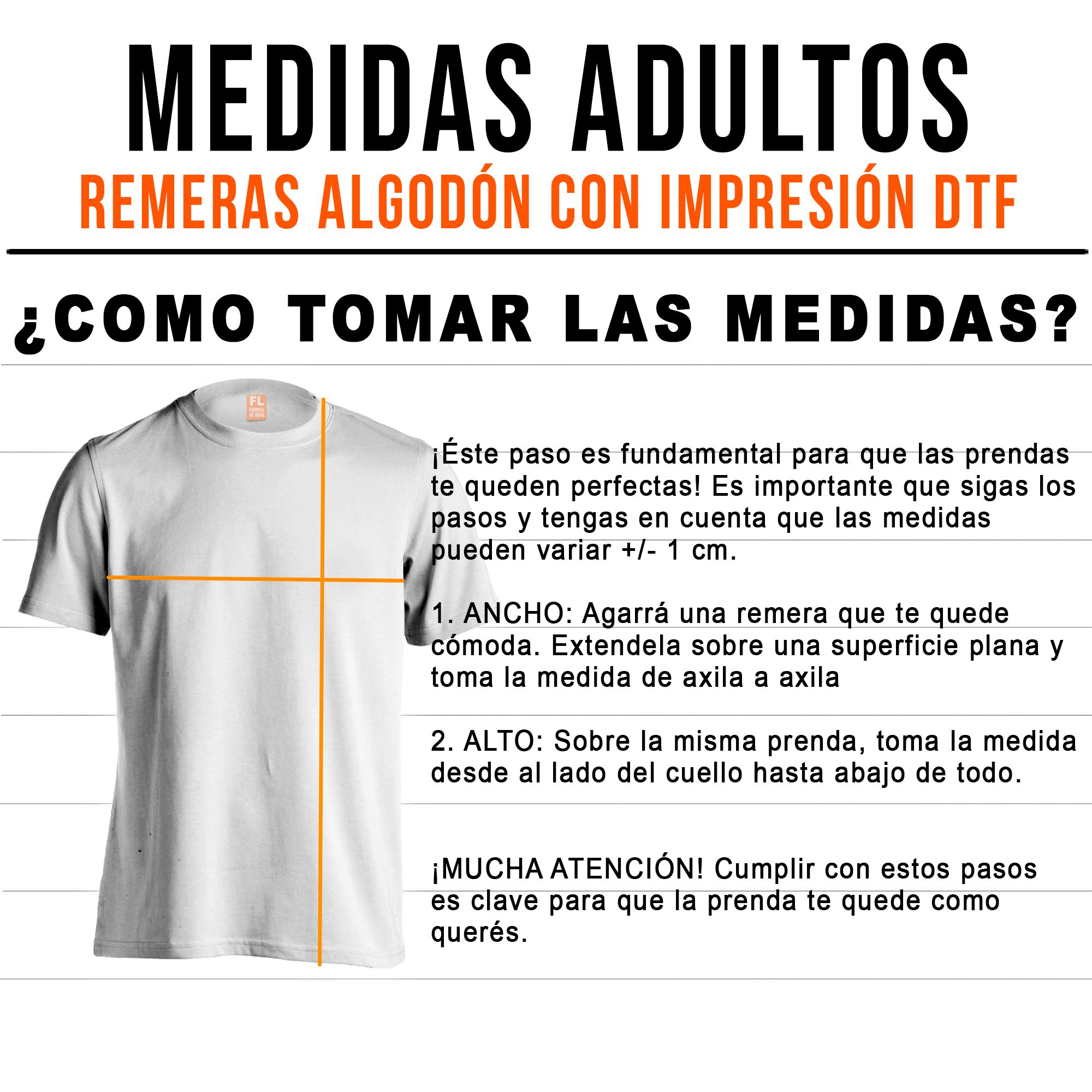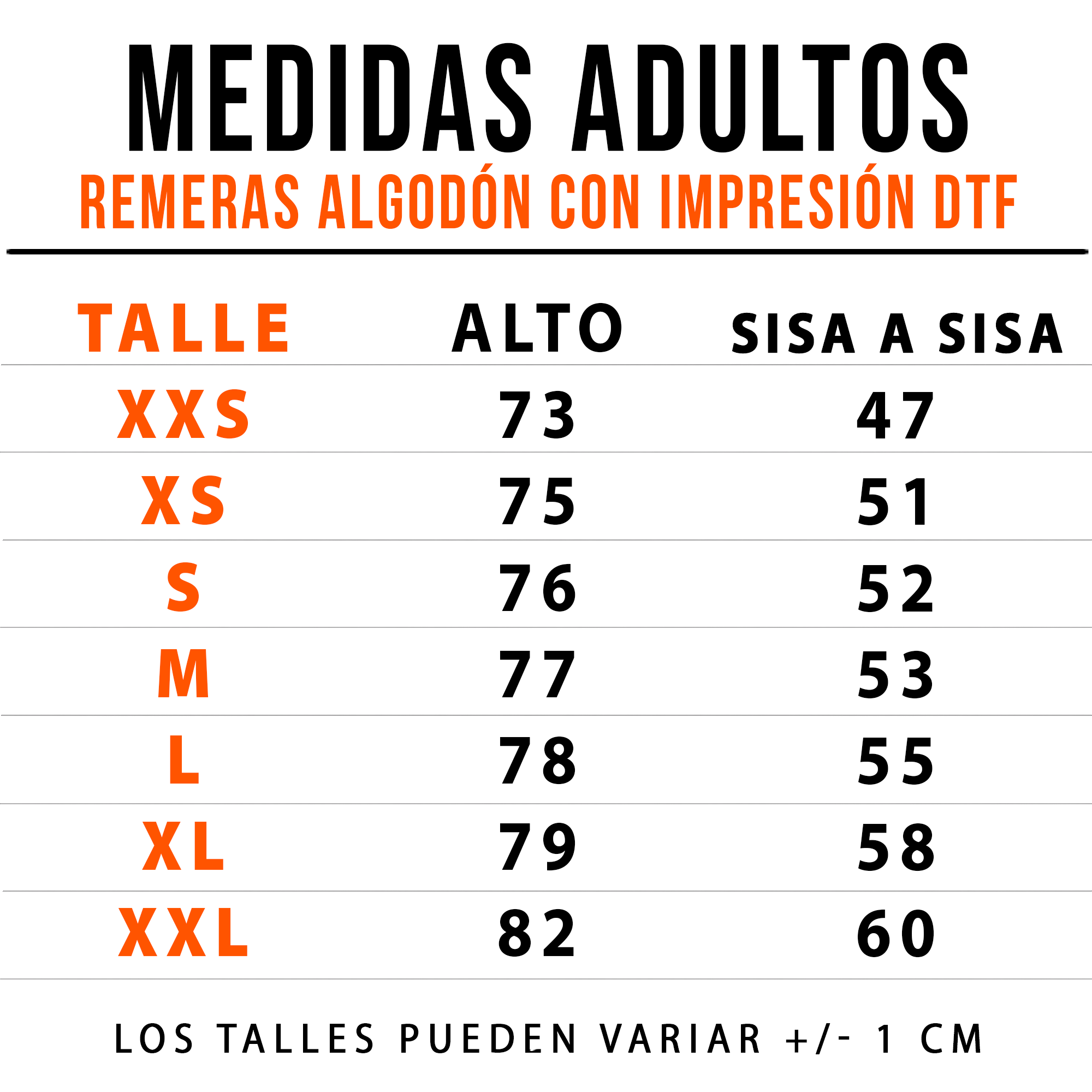 💡 Tip de experto: Nuestras remeras son de Algodón Peinado 24/1. Al ser fibra natural, pueden tener una variación mínima de +/- 1 o 2 cm tras el primer lavado. Si estás entre dos talles, ¡elegí siempre el más grande!